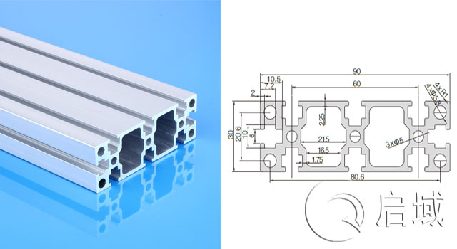 3090國(guó)標(biāo)鋁型材也是屬于槽6系列鋁型材,它的貨號(hào)為QY-6-3090G。這款鋁型材的理論米重是2.88kg,它的壁厚是2.55MM左右的。從這款鋁型材的截面上,我們可以看到30面有一個(gè)槽口,90面有三個(gè)槽口喲!